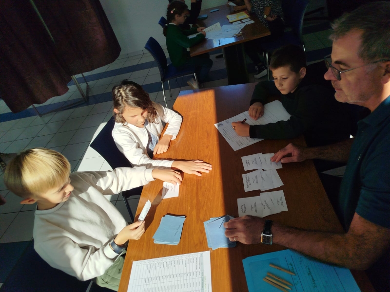 - Les élèves relisent les programmes affichés en mairie avant d’aller voter.